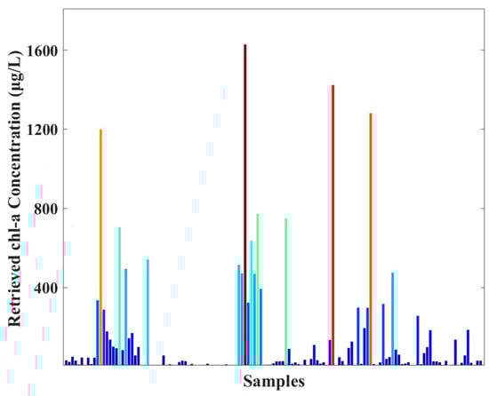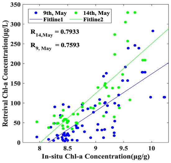 Figure 6 displays the correlation between the chl_a concentration retrievals for 9 and 14 May and the in situ measurements from 11 May. Although the units are inconsistent, there is a strong correlation between the two datasets, which significantly reflects and verifies the reliability of the retrieval results. The retrieval results of these two days were compared with the in situ data, respectively, and both of them reflected a relatively apparent correlation with coefficients of R = 0.7593 for 9 May and R = 0.7933 for 14 May. Meanwhile, the RMSEs on the 9th and 14th were 56.081 ug/L and 86.865 ug/L, respectively.