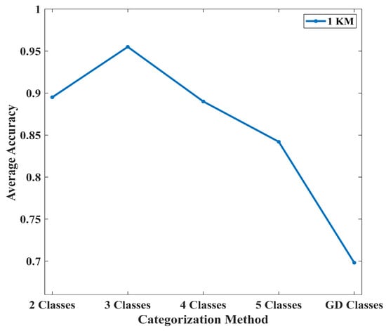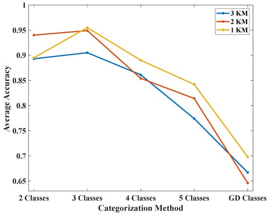 The five-fold validation accuracies of the classification results at different spatial resolutions are shown in Table 4, as well as Figure 12. When the spatial resolution was reduced from 1 km to 2 km or 3 km, the classification accuracy of the model subsequently decreased. The accuracy of the classification results at a 1 km spatial resolution under different classification methods was generally better than at other resolutions. This indicates that higher spatial resolution can obtain higher classification accuracy to some extent.