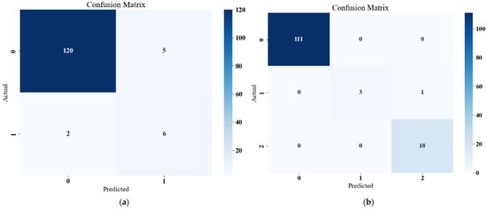 Additionally, the confusion matrix demonstrates the classification results by showing how correctly and incorrectly samples from each class are predicted to be in class . Diagonal elements represent correct classifications, while off-diagonal elements indicate misclassifications, helping to identify common errors and confusion between categories. Figure 9, Figure 10 and Figure 11 illustrate the confusion matrices of model predictions obtained by different classification methods at a 1 km spatial resolution. Categories 0 to 4 refer to different levels of algal blooms, corresponding to Table 3. Figure 9 demonstrates the results of categorizing the retrieval values of chl_a concentration into Classes 2 and 3. The accuracy, average precision, average recall, and average F1 index obtained by the model under this categorization method are maintained at a high level, with fewer misclassifications occurring. However, in the binary categorization, the data representing category 0, which has a lower chl_a concentration, actually shows a relatively high concentration. The sample imbalance in the dataset makes the model less sensitive to the distinguishing features between the two categories. This is one of the reasons why there is more misclassification in category 1, as shown in Figure 9a. But, Figure 10 shows the results of categorizing the retrieval values of chl_a concentration into categories 4 and 5. As the number of classification categories increases, the misclassification phenomenon begins to increase, and the classification accuracy of the model appears to be reduced to a certain extent. However, the overall classification accuracy remains around 0.85, which is within an acceptable range. Figure 11 demonstrates the results of classification according to the local standards of Guangdong Province. When classified according to the local standards, the differences in features between different categories are not distinct enough, resulting in more cases of misclassification.
