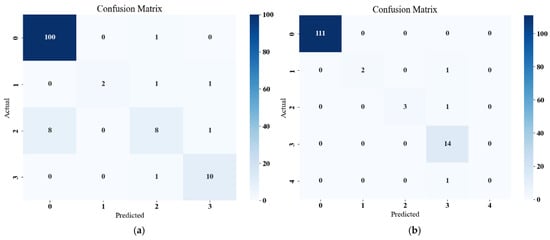 Model classification confusion matrix for 4 Classes (a) and 5 Classes (b) classification criterion.