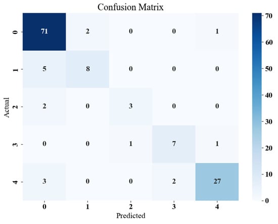 The performance of the algal blooms monitoring model, based on CYGNSS data, is evaluated using a confusion matrix. The confusion matrix is a tool used to assess the performance of classification algorithms, particularly for multiclass problems [13]. It compares the model’s predictions with actual labels, providing a breakdown of correct and incorrect classifications. Each element in the matrix represents the number of samples predicted to be class when the actual label is class . A sufficient sample size helps the model learn the true distribution of the data, thereby improving prediction accuracy and robustness. In this multiclass scenario, most data are categorized as “No Bloom” or “Mild”, resulting in relatively stable and accurate prediction accuracy for the “No Bloom” class compared with other categories (over 90%). This is due to data imbalance, which could be addressed in future research by adjusting the distribution of bloom and no-bloom samples to further explore the model’s ability to detect algal blooms [48].