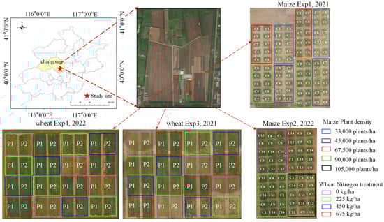 This study was conducted at the National Precision Agriculture Research Center in Xiaotangshan (40.17°N, 116.43°E), Changping District, Beijing, China. Field experiments involving maize and wheat were carried out from 2021 to 2022, encompassing a total of 11 cultivars and 6 planting densities (Figure 1). Experiments 1 and 2 focused on maize cultivation. In Experiment 1, five maize varieties—Zhengdan958, Jingjiu16, Tianci19, Jingnuo2008, and Nongke336—were planted at four different densities: 33,000, 45,000, 67,500, and 90,000 plants per hectare, each with four replications. Experiment 1 comprised a total of 80 plots. Experiment 2 included five other maize varieties—Zhengdan958, XianYu335, Jingnong728, Chengdan30, and Jingpin6—planted at densities of 45,000, 67,500, 90,000, and 105,000 plants per hectare, with three replications, totaling 60 plots. Experiments 3 and 4 involved wheat cultivation. These experiments included two wheat varieties—Jinghua11 and Zhongmai1062—with four nitrogen fertilizer treatments and four replications, resulting in 32 plots per experiment. The plant density for wheat was maintained at 37,440 plants per hectare.