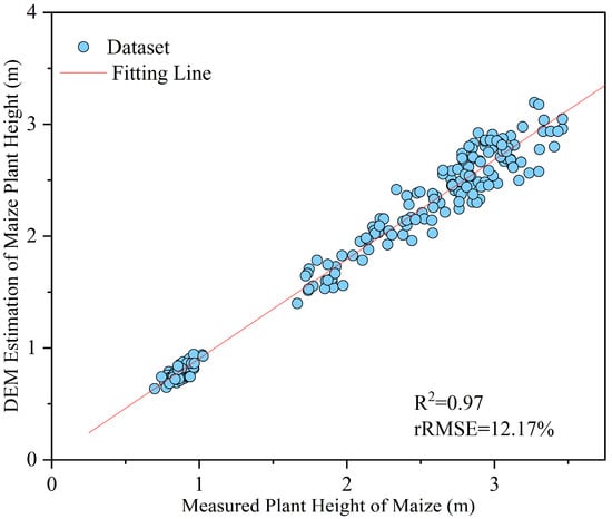 To validate the accuracy of the UAV-derived maize PH, 220 sample measurements across three growth stages were compared with ground truth measurements. The validation results showed a coefficient of determination (R2) of 0.97 and a relative root mean square error (rRMSE) of 12.17% (Figure 2), indicating high accuracy of the PH extraction method.