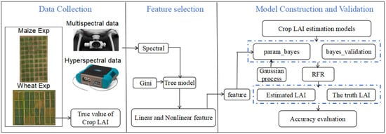 Therefore, this study aims to improve LAI estimation by integrating feature selection and Bayesian hyperparameter optimization of RFR models. We conducted a two-year field experiment on maize and wheat to acquire LAI, hyperspectral, multispectral, and RGB data. The specific objectives were as follows: (1) To construct an RFR model for LAI estimation using the original features and optimize its hyperparameters using Bayesian optimization, evaluating the estimation accuracy before and after optimization. (2) To identify important features for LAI estimation by comparing filtering methods (correlation analysis) and embedded methods (tree model-based feature selection). (3) To evaluate the performance of the coupled Bayesian-optimized RFR model with selected features for LAI estimation.