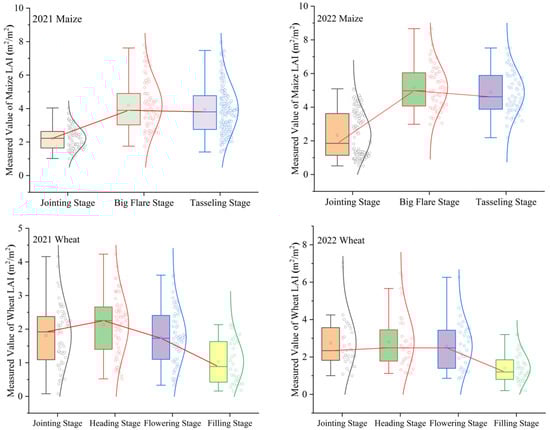 Box plots of measured LAIs for maize and wheat at different growth stages. Note: The different color lines represent the normal distribution of different growth stages.