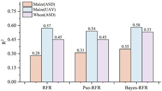 As illustrated in Figure 10, under the Maize_ASD dataset, the Bayes-RFR algorithm achieved an R2 of 0.37, representing a 27% improvement over the RFR algorithm’s R2 of 0.29. For the Maize_UAV dataset, the Bayes-RFR algorithm’s R2 of 0.66 is a 12% improvement compared to the RFR’s R2 of 0.59. In the Wheat_ASD dataset, the Bayes-RFR algorithm attained an R2 of 0.69, which is 47% higher than the RFR algorithm’s R2 of 0.47. These results indicate that the Bayes-RFR model consistently outperforms the standard RFR model in terms of R2 values. Although the R2 of the Bayes-RFR model is lower on the test set compared to the training set, it still surpasses the RFR model, demonstrating a higher predictive accuracy.
