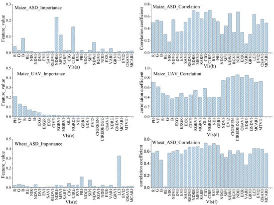 (a–f) Comparison of feature importance and correlation coefficients across different datasets. Note: (a,c,e) stands for feature importance of Maize_ASD, Maize_UAV, Wheat_ASD; (b,d,f) stands for correlation coefficients of Maize_ASD, Maize_UAV, Wheat_ASD.