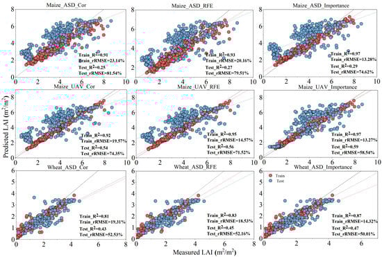 The experimental results also revealed a significant difference in accuracy between the Maize_ASD dataset and the other two datasets (Figure 10). The Maize_ASD dataset exhibited much lower accuracies, which can be attributed to variations in crop varieties and planting densities over the two years of the study. It is presumed that the plots with different varieties and planting densities contributed to the lower predictive performance with the Maize_ASD dataset. In contrast, the Wheat_ASD dataset showed much higher accuracies, likely because the same variety and planting density were maintained over the two years. Additionally, in the Maize_UAV dataset, both the plant height and vegetation cover were measured. Under identical coverage conditions, taller plants generally have more leaves, resulting in higher LAI values. A higher vegetation cover typically indicates denser vegetation and larger leaf areas, leading to an increased LAI. Therefore, the inclusion of structural features in the Maize_UAV dataset contributes to its higher accuracy compared to the Maize_ASD dataset.