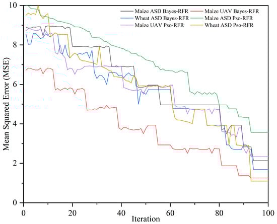 In this study, both the Bayes-RFR and Pso-RFR models were trained using the same number of iterations and datasets (Figure 8), primarily using the mean squared error (MSE) as the evaluation metric to determine the optimal hyperparameters (Table 6). Figure 8 illustrates that both models reached a stable state after 100 iterations across the different datasets. The optimal hyperparameters, determined by minimizing the MSE, are presented in Table 6. Notably, the optimal hyperparameter combinations varied significantly among the models, highlighting the complexities involved in model tuning. We observed that once the number of iterations exceeded 90, the optimization process generally stabilized. For example, when applying the Bayes-RFR model to the Maize_UAV dataset, the optimal hyperparameters were n_estimators = 510, max_depth = 7, and min_samples_leaf = 1, yielding the smallest MSE. Under these optimal hyperparameters, the predicted LAI values closely approximated the actual values, as shown in Figure 9.