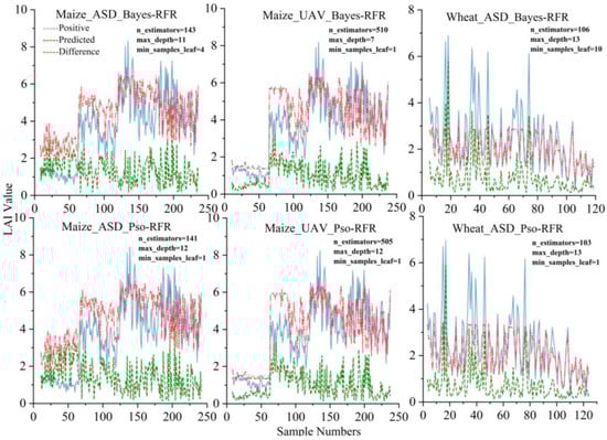 Based on the selected features, we used the difference between the predicted and actual LAI values as an evaluation index to assess the fit of the optimized RFR models (represented by the green line in Figure 9). During the parameter optimization process for both the Bayes-RFR and Pso-RFR models, we observed dynamic changes in the iterative optimization as the number of samples varied. Although both models’ LAI estimates closely matched the true values (Figure 9), the Bayes-RFR model demonstrated a superior performance compared to the Pso-RFR model. This efficiency is attributed to the Bayes-RFR model’s use of a Gaussian process to represent the prior distribution of the objective function, allowing it to update the estimates based on existing evaluation results.