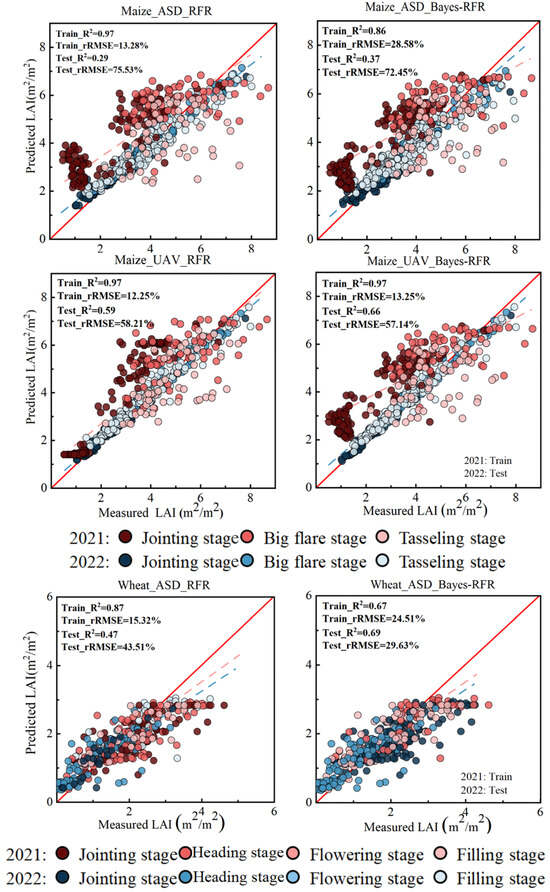 To validate the stability of the Bayes-RFR model, we conducted an additional experiment using the 2022 data as the training set and the 2021 data as the test set (Figure 12). The results showed that while the R2 values decreased and the rRMSE values increased compared to the original training and test sets, the Bayes-RFR model could still predict the 2021 LAI using the 2022 dataset, indicating its robustness.