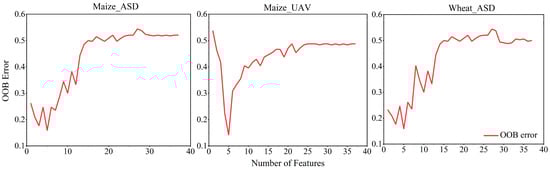 The number of selected features (f) is a key parameter influencing the predictive ability of the RFR model. Under the Maize_ASD, Maize_UAV, and Wheat_ASD datasets, we determined that selecting the top five features yielded the best performance (Section 3.3). Since the generalization error of the RFR algorithm cannot be calculated directly, we utilized the Out-of-Bag (OOB) error estimation method proposed by Breiman [65]. By observing changes in the OOB error as f increased, we found that the error decreased initially and then increased after f = 5 (Figure 11). Therefore, selecting five features was optimal for our models.
