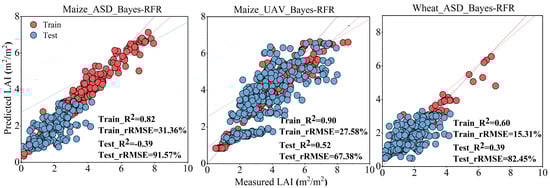 To further compare the Bayes-RFR and standard RFR models, we found that the Bayes-RFR achieved the highest coefficient of determination (R2) on both the training and test sets across the Maize_ASD, Maize_UAV, and Wheat_ASD datasets (Figure 7 and Figure 10). This suggests that the Bayes-RFR model enhances the stability and accuracy of LAI estimation.
