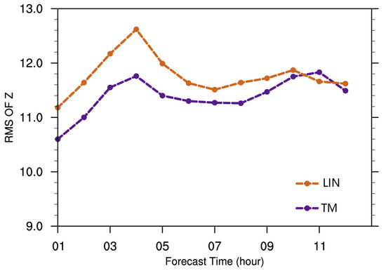 To quantitatively evaluate the forecasts of the two experiments, Figure 11 examines the hourly composite reflectivity forecast errors relative to the reflectivity observations. The root mean square errors (RMS) of the forecasted reflectivity are calculated for all grid points where the observed reflectivity is greater than 15 dBZ. Compared with the LIN experiment, the forecast skills of the TM experiment within the first 9 h are better, especially during the first 3 h when the root mean squares are significantly lower. The advantage of the TM reflectivity operator gradually disappears, and the forecasting performance becomes comparable to that of the LIN experiment after 10 h.