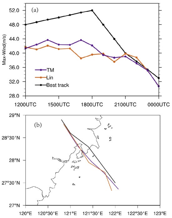 Twelve-hour forecast of (a) maximum wind speed and (b) track for the 12 h forecasts from 1200 UTC August to 0000 UTC 10 August 2019 by the LIN (orange lines) and TM (purple lines) experiments. The black lines denote the results of the Tropical Cyclone Best Track Dataset from the China Meteorological Administration.