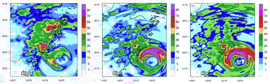 Compared with the observations, both TM and LIN experiments overestimate the precipitation intensity in the core region of the typhoon, with the forecasted precipitation location deviating from the observation, and the forecasted range of heavy precipitation in the core region is larger and located further northward (Figure 13). Due to the adjustments on the initial position and track forecast by the TM experiment, the location of heavy precipitation is also adjusted. Under this adjustment, the forecasted precipitation is closer to the observations in terms of intensity and location (Figure 13a,c). For precipitation in the outer rainbands, the TM experiment improves the forecast accuracy over the LIN experiment, resulting in a larger range of heavy precipitation near Taizhou. Additionally, the precipitation south of Hangzhou Bay is well captured, which is more consistent with the observations.