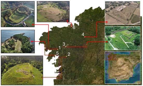 Location of case studies at the Northwest of Spain. Case 1: Castro de Comparada. Case 2: Castrolandín. Case 3: A Rocha Forte Castle. Case 4: Ciudadela de Sobrado dos Monxes. Case 5: Castro Neixón. Case 6: Castro de Elviña.