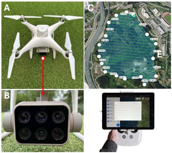 The UAS utilizes Real-Time Kinematic (RTK) positioning systems to ensure accurate location data throughout the flight, providing high-quality georeferenced images. With a flight time of up to 27 min per battery, it allows for extensive coverage in a single flight session, which supports precise detection of vegetation and other terrain details. As the Phantom 4 Multispectral’s remote control does not have an integrated screen, flight planning and control are managed using the DJI GS Pro application installed on a 10-inch Apple iPad, as shown in Figure 3B.