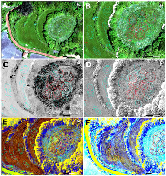 In this case study, three multispectral flights were conducted: in the summer of 2022 and in the winter and spring of 2023. Figure 16A presents the false color composition 123 from August 2022, while Figure 16C,E show the RGB orthomosaics from February and April 2023, respectively. Figure 16B,D,F correspond to the NDVI indices for the same periods. The site features two clearly distinct areas: one of grassland and the other of scrubland, the latter having been affected by a fire prior to data acquisition. The results reveal the presence of crop marks in both areas, which could potentially correspond to castro-style dwellings or defensive structures. In the grassland area, the flight conducted during the dry summer of 2022 provides the best results for detecting crop marks. Conversely, the flight in May 2022, during mid-spring, shows the least prominent crop marks. In red, the most evident marks, mostly extracted from the NDVI index, are shown. In cyan, less evident marks extracted from other indices or compositions are displayed.