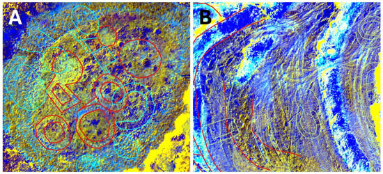 Specific enhancement adjustments were applied to each area of the site using the first three PC, which highlighted areas of particular interest. In Figure 6A, corresponding to a predominantly scrubland area, the adjusted enhancements allowed for clearer identification of crop marks. In contrast, Figure 6B shows a pasture area with specific enhancement adjustments for that zone, where both archaeological crop marks and recent agricultural machinery marks were detected. The latter complicates the interpretation of results, as they can easily be confused with archaeological crop marks.
