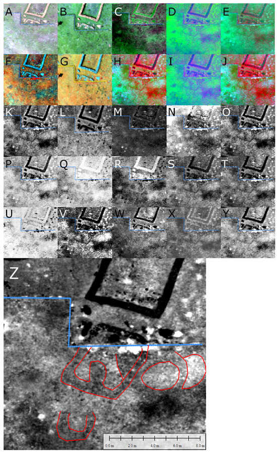 Mosaic of color compositions and indices. (A) RGB—August 2021. (B) RGB—May 2022. (C) PCA August 2021, composition 123. (D) PCA August 2021, composition 147. (E) PCA August 2021, composition 159. (F) Color Infrared August 2021, composition 521. (G) Color Infrared May 2022, composition 521. (H) Combined PCA, composition 149. (I) Combined PCA, composition 147. (J) Combined PCA, composition 159. (K) NDVI August 2021. (L) NDVI May 2022. (M) NDVI RE August 2021. (N) NDRE August 2021. (O) SAVI August 2021. (P) NLI August 2021. (Q) GEMI August 2021. (R) TVI August 2021. (S) MTVI August 2021. (T) ChiGREEN August 2021. (U) TCARI August 2021. (V) MCARI August 2021. (W) ARI August 2021. (X) NGRDI August 2021. (Y) GDVI August 2021. (Z) Crop marks on NDVI August 2021.