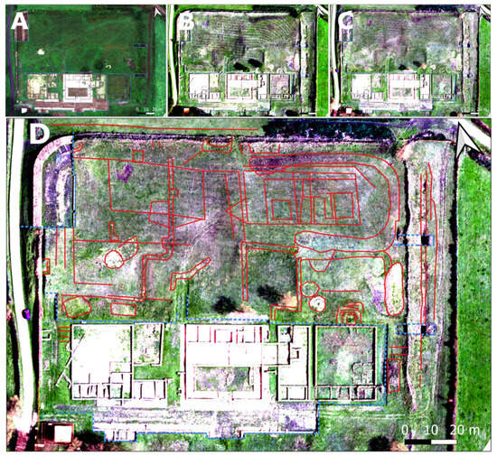 In the third case study, a single flight was conducted. Figure 9A shows the obtained RGB orthomosaic. Figure 9B presents the vectorization of the crop marks on this orthomosaic, while Figure 9C illustrates the same crop marks on the NDVI index. The cyan lines indicate the location of the site’s outer wall, while the red lines indicate other crop marks detected in the various indices and color compositions.