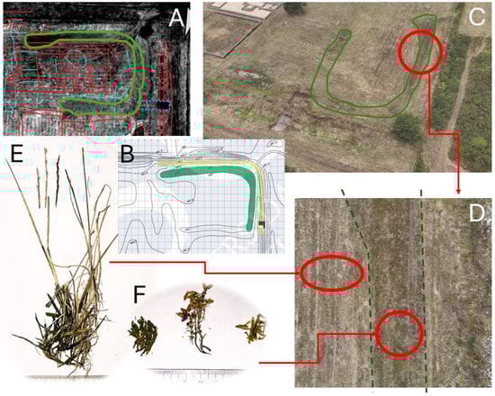 Among the detected crop marks, one in the shape of a ‘U’ is particularly notable (Figure 13), indicated in green in the figure. It is in the northeast of the site and is known to have been caused by the earth mounds (terreras) from the 1934 excavation directed by S. González and Á. del Castillo, which were removed during the 2009 excavation and consolidation campaign [44]. It is important to note that the variability in vegetation appears to have facilitated the detection of this crop mark. There is a predominance of shrub species and moss (Figure 13D) in the crop mark area, compared to the predominance of herbaceous species (Figure 13E) in the area adjacent to the crop mark.