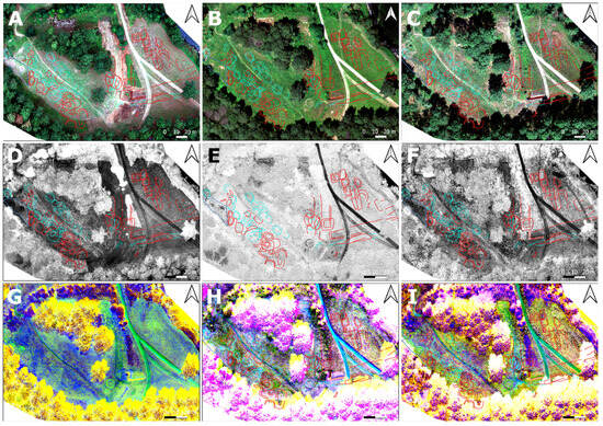 (A) RGB September 2021; (B) RGB May 2022; (C) RGB September 2022; (D) NDVI September 2021; (E) NDVI May 2022; (F) NDVI September 2022; (G) PCA September 2021–May 2022; (H) PCA May 2022–September 2022; (I) PCA September 2021–September 2022. The arrow indicates north.