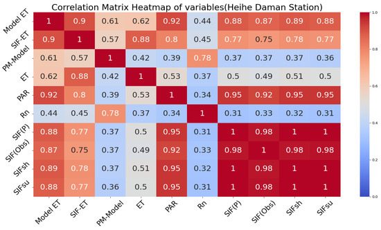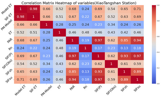 Furthermore, the partitioned SIF data used in this study, referred to as SIF(P), which include both sunlit (SIFsu) and shaded (SIFsh) components, showed higher correlations. This suggests that partitioned SIF captures different aspects of environmental processes, aligning with findings from Yuan et al. (2015) [62], which emphasize the robust performance of the Penman–Monteith model and the contextual nature of SIF data. The correlation matrix heatmap for Xiaotangshan Station illustrates the significant benefits of partitioning Sun-Induced Fluorescence (SIF) to enhance the accuracy of Model ET. By separating SIF into sunlit and shaded components, the correlation between Model ET and the combined SIF partition (SIF(P)) is 0.69, reflecting a strong positive relationship. This partitioning approach offers a more nuanced understanding of canopy photosynthesis by accounting separately for the contributions of shaded and sunlit leaves. The individual correlations of SIFsu and SIFsh with Model ET are 0.71 and 0.65, respectively, highlighting the importance of both components in capturing variations in light use efficiency and transpiration rates (see Figure 1).