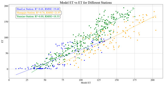 Figure 5 illustrates the correlation between Evapotranspiration (ET) and the Penman–Monteith (PM) model across HuaiLai, Shangqiu, and Yunxiao. HuaiLai Station shows a strong positive correlation with an R2 value of 0.74 and an RMSE of 10.46, indicating a high degree of agreement between Model ET and the PM model (Figure 5). Shangqiu Station exhibits a moderate positive correlation with an R2 value of 0.46 and a higher RMSE of 17.78, suggesting lower predictive accuracy and more significant variability in the data. Yunxiao Station demonstrates the highest correlation, with an R2 value of 0.75 and an RMSE of 8.34, highlighting the model’s robust performance at this location. The dashed lines represent the linear regression fits for each station, visually confirming the strength of these correlations and providing insights into the model’s effectiveness across different geographical areas.