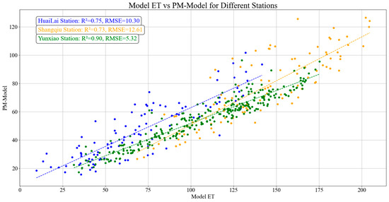 Correlation analysis between Model ET and the Penman–Monteith (PM) model reveals a compelling trend across HuaiLai, Shangqiu, and Yunxiao Stations, with R2 values of 0.75, 0.73, and 0.90, respectively (Figure 4). This indicates that Model ET aligns closely with the PM model and shows increasing efficacy in replicating ET measurements from HuaiLai to Yunxiao. The exceptionally high R2 value at Yunxiao underscores the model’s superior performance in this region, suggesting that Model ET offers a more refined and accurate representation of ET compared to the PM model. The consistent correlation across all stations highlights the robustness of Model ET, demonstrating its potential as a valuable tool for ET estimation in diverse settings.