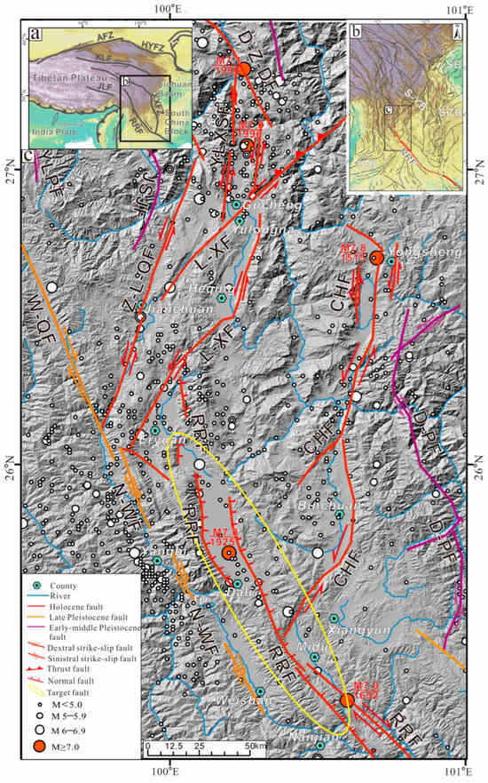 - Wen, X.; Ma, S.; Fang, L.; Liang, M.; Du, F.; Long, F.; Zhao, X. Complex structural fault system and distributed deformation across the big bend of the Red River Fault, Yunnan, China. Phys. Earth Planet. Inter. 2022, 333, 106942. [Google Scholar] [CrossRef]