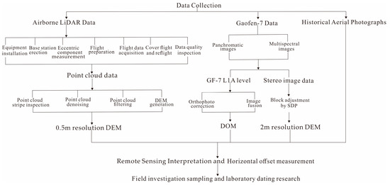 The analysis of remote sensing images can reveal the overall distribution of active faults and other active structures from a macroscale perspective and it can also directly provide fault activity information for the analysis of seismogenic structures, areas prone to strong earthquakes, the activity states of faults, and their relationships with seismic activity [1]. Using high-resolution images to interpret the intricate details of faults can help us to obtain the precise geometric structure and spatial distribution of faults. The emergence of digital elevation model (DEM) extraction technology on the basis of high-resolution satellite stereoscopic images has greatly improved the acquisition efficiency of topographic and geomorphic data. GaoFen-7 (GF-7) is the first optical stereoscopic mapping satellite in China with a 0.8 m resolution, and it has significant potential to provide high-resolution geomorphic and topographic data for quantitative studies of active structures [2,3]. Similarly, airborne LiDAR technology can also help us obtain higher resolution topographic and geomorphic data. For the past few years, airborne light detection and ranging (LiDAR) technology has developed rapidly in the study of active faults and has become an important means of obtaining 3D surface data accurately, quickly, and reliably. The most attractive advantage of airborne LiDAR is that the laser beam can penetrate vegetation to reach the ground and can accurately measure the surface morphology, thereby yielding high-precision elevation data of the real geomorphic surface. These data can reveal evidence of fault activity at the surface at the appropriate scale (m) and precision (dm) based on the extraction of high-precision microgeomorphic information. LiDAR data have been extensively utilized in the study of active structures [4,5,6,7,8]. Owing to its advantages of being macroscopic and intuitive, high-resolution remote sensing technology has been increasingly utilized in the research of active faults. At present, remote sensing has developed into an indispensable technology in the research of active faults and provides rich quantitative data for the study of active faults [9,10].