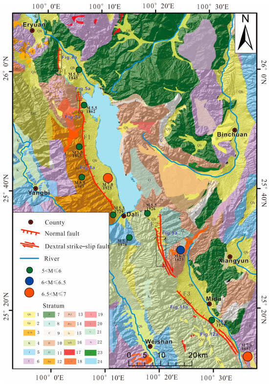 The lithological map of active faults in the study area. F1: Cangshan Piedmont Fault; F2: Fengyi–Dingxiling Fault; and F3: Midu Basin Margin Fault. Stratum: 1, Holocene alluvial sediment; 2, Pleistocene alluvial sediments; 3, Tertiary; 4, Cretaceous; 5, Jurassic; 6, Triassic; 7, Permian; 8, Silurian; 9, Carboniferous; 10, Devonian; 11, Ordovician; 12, Pre-Ordovician Cangshan Group; 13, Neoproterozoic; 14, Palaeoproterozoic; 15, grey limestone; 16, brown schist; 17, syenite porphyry; 18, granite porphyry; 19, diorite; 20, granite; 21, gabbro; 22, mafic rock; 23, diabase gabbro; and 24 lake (the active faults and geology is modified from [22]).