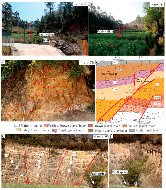 Field verification of the linear characteristics of the Fengyi–Dingxiling Fault: (a,b) photographs of the fault troughs; (c) photograph of the outcrop with faulted strata; (d) interpretative geological section; (e) photograph of the faulted outcrop; and (f) photograph of the fault spring (The red arrow represents where the fault passes).