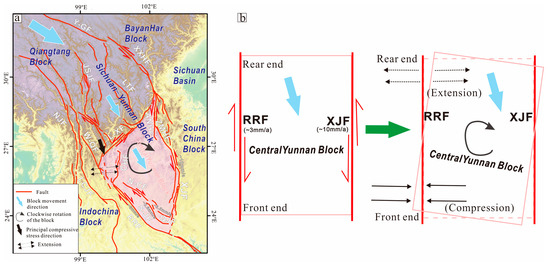 The Sichuan–Yunnan Block is separated into the Northwest Sichuan Block and the Central Yunnan Block by the Ljiang–Xiaojinhe Fault. The eastern boundary of the Central Yunnan Block is composed of the Xiaojiang Fault, Zemuhe Fault, and Anninghe Fault, all of which exhibit left-lateral strike-slip movement, and the sliding rate of the Xiaojiang Fault is about 10 mm/yr. The western boundary of it is the Red River Fault Zone, which experiences right-lateral strike-slip movement and its rate is about 3 mm/yr (Figure 15a). Based on the focal mechanism solutions data around the Red River Fault Zone, Guo et al. [22] proposed that the principal compressive stress axis in this region is mainly NNW, with a trend direction of 330°, especially in northwest Yunnan, where the focal rupture has a large dip-slip tensile component obtained from the P-axis solutions of multiple nodal planes. Due to the impact of the boundary fault zones on both sides, which have opposing shear directions, as well as a significantly higher sliding rate on the eastern boundary, the Central Yunnan Block rotates in a clockwise direction while also shifting toward the southeast. Under these conditions, the boundary faults at the front and rear of the block are subjected to different forces. The northern segment of the Red River Fault Zone is positioned at the rear of the Central Yunnan Block. As the block undergoes clockwise rotation, it is subjected to tensile forces, resulting in the northern section functioning as a tensile tectonic region primarily characterized by vertical displacement. Therefore, a simple model diagram of the tension zone of the northern section is proposed (Figure 15b). In contrast, the southern segment is positioned at the front end of the Central Yunnan Block, so it is subject to compression, which is also consistent with the compressional thrust component [56]. We suggested that the tensile region of the northern section of the Red River Fault represents the local strain response of the block in relation to the boundary faults as it rotates in a clockwise direction, which reflects the deformation coordination of the inner Sichuan–Yunnan Block rotation and boundary fault slip under the southeastwards extrusion of the Qinghai–Tibetan Plateau continental block to a certain extent [16,56,57].