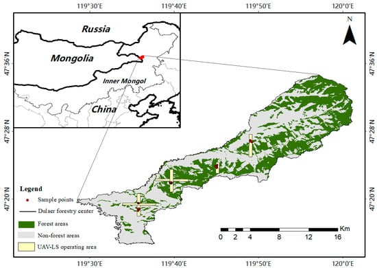 The research area is located in the Dural National Forest Farm, Arxan city, Hinggan League, Inner Mongolia Autonomous Region of China (119°28′–120°01′E, 47°15′–47°35′N), which is a comprehensive forest farm integrating both natural and artificial forests (Figure 1—Some of the sampling sites are located outside of the yellow box labeled as the UAV-LS working area. However, in the actual study, the sample plots used in the estimation of AGCs were those within the yellow boxes). This region, situated in the Hinggan League of the Inner Mongolia Autonomous Region of China, is an important natural ecological conservation area. The total area of the Dural Forest Farm is 49,812 hectares, 33,466 hectares of which are designated for forestry, accounting for 67% of the total area. The forest coverage rate is as high as 48.3%, with an altitude ranging from 792 to 1495 metres. The region experiences a cold temperate continental monsoon climate, with an average annual temperature of 1.48 °C, an average temperature of −25.6 °C in the coldest month, and an average temperature of 16.6 °C in the hottest month. The average annual precipitation is 437 mm. The main tree species of the forest are B. platyphylla and L. gmelinii, along with a minority of Populus davidiana and Pinus sylvestris. Most of the area has good site conditions, with similar forest types distributed in concentrated and contiguous areas, which is beneficial for forest management and operation [29].