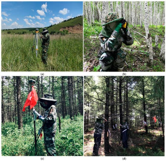 Parameter measurements in the study area: (a) Setup of base stations. (b) Tree height measurement. (c) Obtaining the coordinates. (d) DBH measurement and recording.