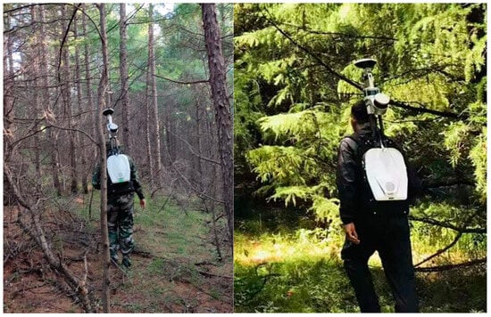 In this study, we employed the LiBackpack DGC 50 backpack laser scanner developed by Beijing Greenvalley Technology Co., Ltd. (Beijing, China) (Figure 3). This device efficiently captures tree point cloud data within plots using a designed “S”-shaped hiking route for data collection [38]. The choice of the LiBackpack DGC 50 was based on its effective data collection capability and reliable data quality assurance. During data collection, the operator connects to the backpack laser scanner via a smartphone to monitor the number of satellite signals and real-time point cloud scanning status. To ensure the quality of the point cloud data, steady movement is required during collection, especially at turns, to ensure data accuracy and completeness.