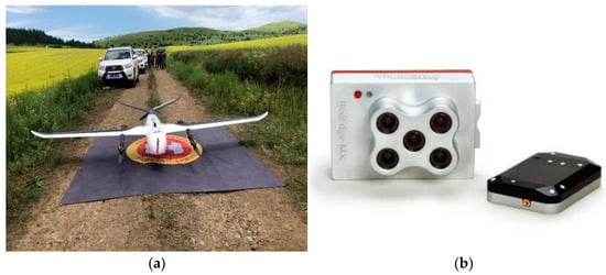 (a) Pegasus V300 drone and (b) multispectral D-CAM2000 sensor.