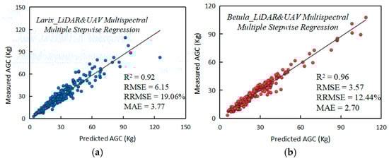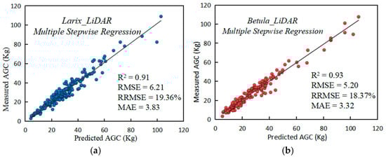 Using the aforementioned formulas, the AGC of L. gmelinii and B. platyphylla forests was predicted using LiDAR data. Figure 9 shows the results of the accuracy validation of the AGC predicted by the LiDAR MSLR model compared with the AGC estimated in the field in L. gmelinii and B. platyphylla forests. As demonstrated, the AGC of L. gmelinii and B. platyphylla predicted by LiDAR using the MSLR model was significantly correlated with the measured AGC, with R2 values of 0.91 and 0.94, RMSE values of 6.21 and 5.20, RRMSE values of 19.36% and 18.37%, and MAE values of 3.83 and 3.32, respectively. Among the two different tree species, the R2, RMSE, RRMSE, and MAE values were greatest for the B. platyphylla forests.