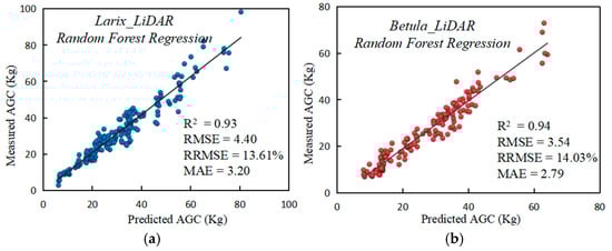 Forest AGC (Tg) of (a) Larix and (b) Betula measured by LiDAR using the RF model versus the predicted forest AGC. (Blue dots indicate data sample points for Larix; red dots indicate data sample points for Betula).