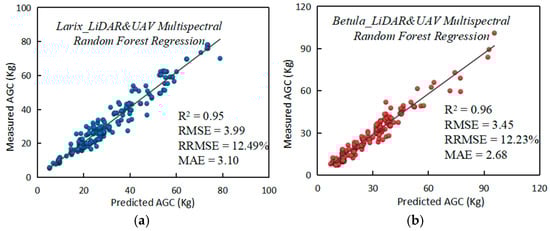 Figure 12 shows the results of the accuracy validation of the AGC predicted by the multisource remote sensing RF model compared with the AGC estimated in the field in L. gmelinii and B. platyphylla forests. The results indicate a significant correlation between the predicted AGC via multisource remote sensing via the RF model and the measured AGC for both tree species. The R2 values for L. gmelinii and B. platyphylla were both 0.95, the RMSE values were 3.99 and 3.45, the RRMSE values were 12.49% and 13.83%, and the MAE values were 3.10 and 2.78. Among these two different tree species, the R2, RMSE, RRMSE, and MAE values were greatest in B. platyphylla forests. Moreover, compared to the AGC predicted solely with LiDAR, there was an improvement in accuracy of 0.02 for L. gmelinii and 0.01 for B. platyphylla.