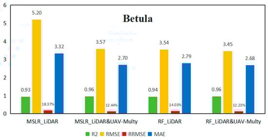 In this study, 186 L. gmelinii trees and 164 B. platyphylla trees were randomly selected for RF modeling. Figure 10 shows the results of the accuracy validation of the AGC predicted by the LiDAR RF model compared with the AGC estimated in the field in L. gmelinii and B. platyphylla forests. As illustrated, the AGCs of L. gmelinii and B. platyphylla predicted by LiDAR via the RF model were significantly correlated with the measured AGC, with R2 values of 0.9501 and 0.9618, RMSE values of 4.4023 and 3.54, RRMSE values of 13.61% and 14.03%, and MAE values of 3.2041 and 2.79, respectively. Among the two different tree species, the R2, RMSE, RRMSE, and MAE values were greatest for the B. platyphylla forests. Overall, the fitting models based on RF performed better than those based on MSLR.