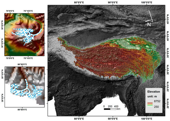 Locations of the TP and glacier study areas measured (the boundary of TP was from https://data.tpdc.ac.cn/zh-hans/data/0c84a954-435d-45f4-bf42-d561f7c7da2a, accessed on 29 August 2024).