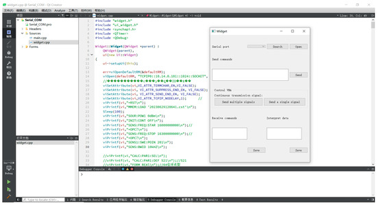 The PC is used for system error correction and display of measurement data and also provides a user interface and remote control interface through software compilation. The PC mainly completes two functions: system control and data processing. In order to achieve remote control of VNA by the computer, the VISA library is pre-installed in the PC, providing a standard Input/Output (I/O) function library for instrument programming. SCPI defines standardized instrument program control messages, respons messages, status report structures, and data formats. Based on the Qt Creator 4.8.2 (software) programming environment, combining SCPI programmable commands, I/O library functions, and C++ programming language can remotely control VNA to achieve signal transmission and reception. Finally, the data stored in the VNA are transmitted to the computer through an Ethernet interface. The software control interface is shown in Figure 5. This section is used for system error correction and the display of measurement data and also provides a user interface and remote control interface.