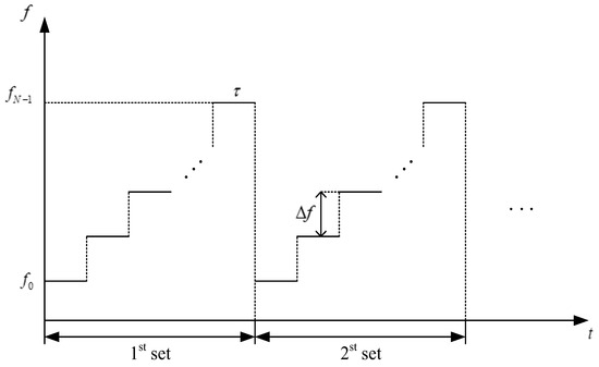 The concept of SFCW was first proposed in 1972 for detecting buried objects. However, extensive research on SFCW radar sensors only began in the early 1990s [42]. The pulse width of the single frequency sub signal of SFCW is , the speed of light is , the starting frequency of the carrier frequency is , the center frequency is , the frequency step is , and the number of frequency steps is . The frequency of the SFCW signal is shown in Figure 6.