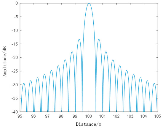 Assuming that the distance between a target and the radar is 100 m, and the bandwidth of the transmitted signal is 300 MHz, simulate the raw data of the target and implement distance compression through IFFT. After interpolation, the signal amplitude is displayed in logarithmic form, and the simulation results of the one-dimensional distance profile are as follows Figure 7.
