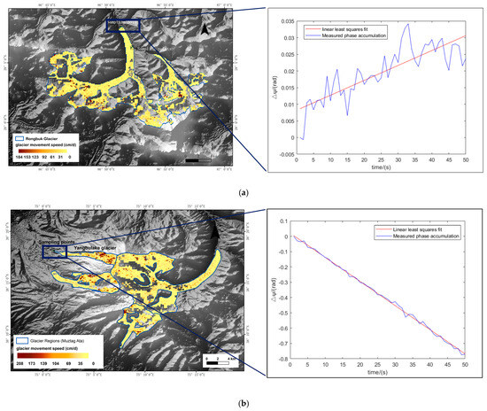 For the phase accumulation map and fitting analysis of the sampling points at the glacier termini by GB radar interferometry measurement on the right side of Figure 8a,b, the determination coefficient of the fitting results at the Rongbuk Glacier termini is 0.68 and the determination coefficient of the fitting results at the Yangbulake Glacier termini is 0.99. The closer the coefficient is to 1, the better the fitting effect. The measured results in the monitoring of the termini of the Yangbulake Glacier are highly consistent with the fitting results, but there are significant differences in the analysis of Sentinel-1 datas results. The GB radar measurement result is 198.96 cm/day, while the Sentinel-1 measurement result is 11 cm/day. Due to the melting season of glaciers during field measurements and the fact that the Yangbulake Glacier is a non debris-covered glacier, its movement speed is very fast. However, the revisit period of the Sentinel-1 radar satellite is relatively long, and the two interfered images differ by 12 days. In addition, the terrain in the study area is complex, and natural phenomena such as snowfall, melting, wind blown snow, avalanches, and cracks can cause changes in the scattering characteristics of the target. Therefore, the misalignment of the two SAR images often leads to some “hollow values” or speed mutation points in the speed map [51]. When the glacier moves too fast and exceeds the monitoring range of offset tracking technology, it is also difficult to monitor the glacier movement. On the other hand, GB radar uses second level sampling, with a total signal acquisition time of less than 1 min, which can obtain information on glacier movement changes better. This also indicates that GB radar interferometry measurement has better monitoring effects when the glacier movement speed is fast.