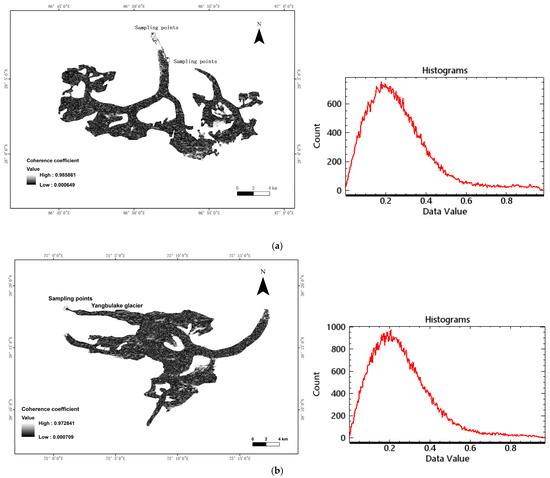 InSAR coherence coefficient maps and statistical results. (a) Coherence coefficient map and statistical results of Rongbuk Glacier; (b) Coherence coefficient map and statistical results of Yangbulake Glacier, etc.